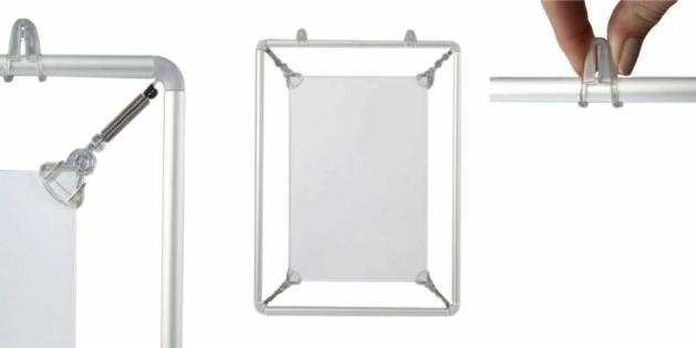 Besonderheit: Leichter Austausch der Motive Lieferumfang: 1 Set besteht aus 4 Aluminiumrohren, 4 Eckverbindungen mit Feder, 4 Kunststoffklemmen sowie 2 Aufhängeösen