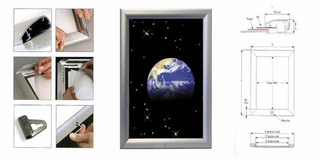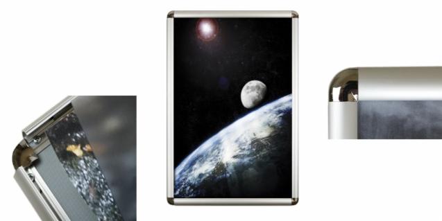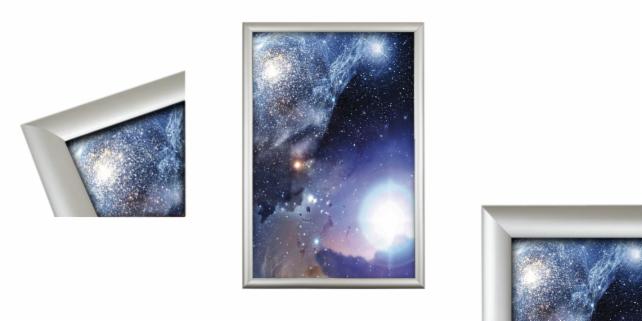 Beschreibung: Sehr leichter Rahmen aus silber eloxiertem Aluminium, in dem das Poster an allen vier Ecken durch Kunststoffclips in Verbindung mit einer Feder befestigt wird. Die Eckverbindungen bestehen aus transparentem Kunststoff.