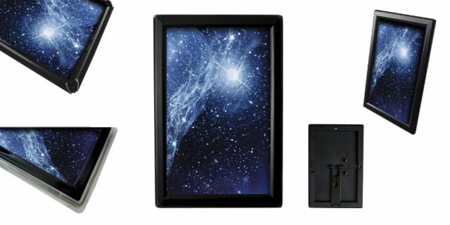 Beschreibung: Schwarzer Aluminiumrahmen mit Kunststoffrückwand. Die Rahmen sind mit einem Standfuß ausgerüstet, der wahlweise vertikal oder horizontal eingesetzt werden kann.
