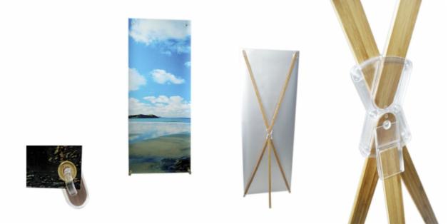 Beschreibung: Sehr edel wirkender X-Banner aus Holz. Einfacher Auf- und Abbau. Das Banner wird an den Ecken mit Ösen versehen und auf das X-förmige System gespannt.