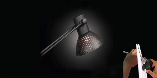 Beschreibung: Spot mit gelöchertem Schirm und Halterung an der vertikalen Stange des Displaysystems