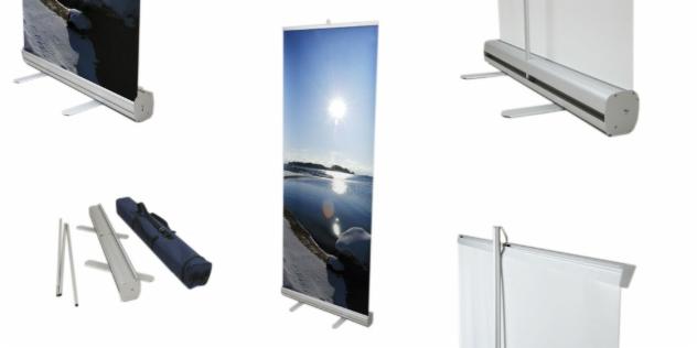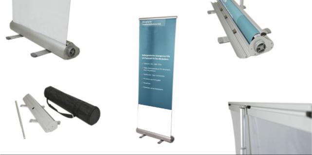Beschreibung: Premium Roll-Up aus Aluminium, extrem standfest, teleskopier- und nachstellbar. Das Banner lässt sich durch eine Federmechanik in die Kassette einrollen und ist somit während des Transportes geschützt.