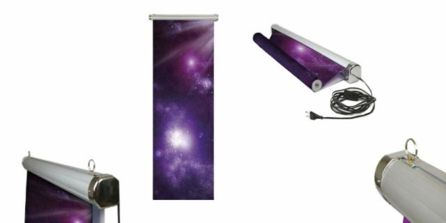 Beschreibung: Rollbanner für Decken- bzw. Wandbefestigung aus Aluminium. Dieses Bannersystem ermöglicht wechselnde Werbemotive, welche durch einen Motor angetrieben werden. Gleichmäßige Bewegung durch mitgelieferte Stange.