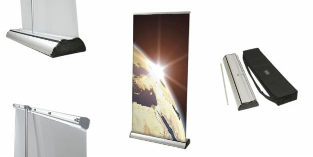 Beschreibung: Dieses sehr stabile, formschöne Premium Roll-Up Bannersystem besteht aus Aluminium. Das Banner wird mit Hilfe einer Klebeschiene im System und an der oberen Leiste befestigt. Eine teleskopierbare Stange ermöglicht Bannerhöhen bis 2130 mm.