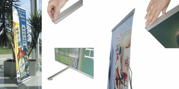 Beschreibung: Das Roll-Up System ist mit herausdrehbaren Standfüßen, einer Aluminiumstange und einer Klemmprofilleiste (oben), sowie Klebefixierung (unten) ausgestattet.