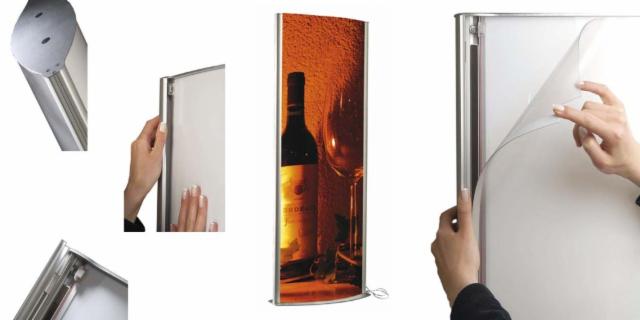 Beschreibung: Beidseitig leuchtender Standpylon für den Innenbereich mit einer Leuchtstoffröhre (58 Watt). Durch die rechts- und links angebrachten Klemmprofile ist das Einlegen oder Austauschen der Motive sehr einfach.