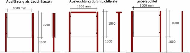 1: Aufsteller, Pfosten aus 80 x 40 x 3 mm Aluvierkantrohr, Pfosten lackiert nach RAL, Ausführung als Leuchtkasten,
